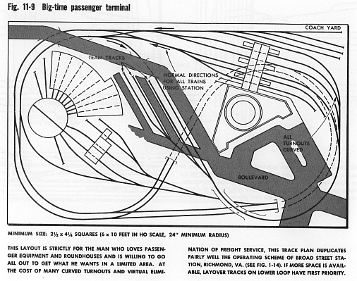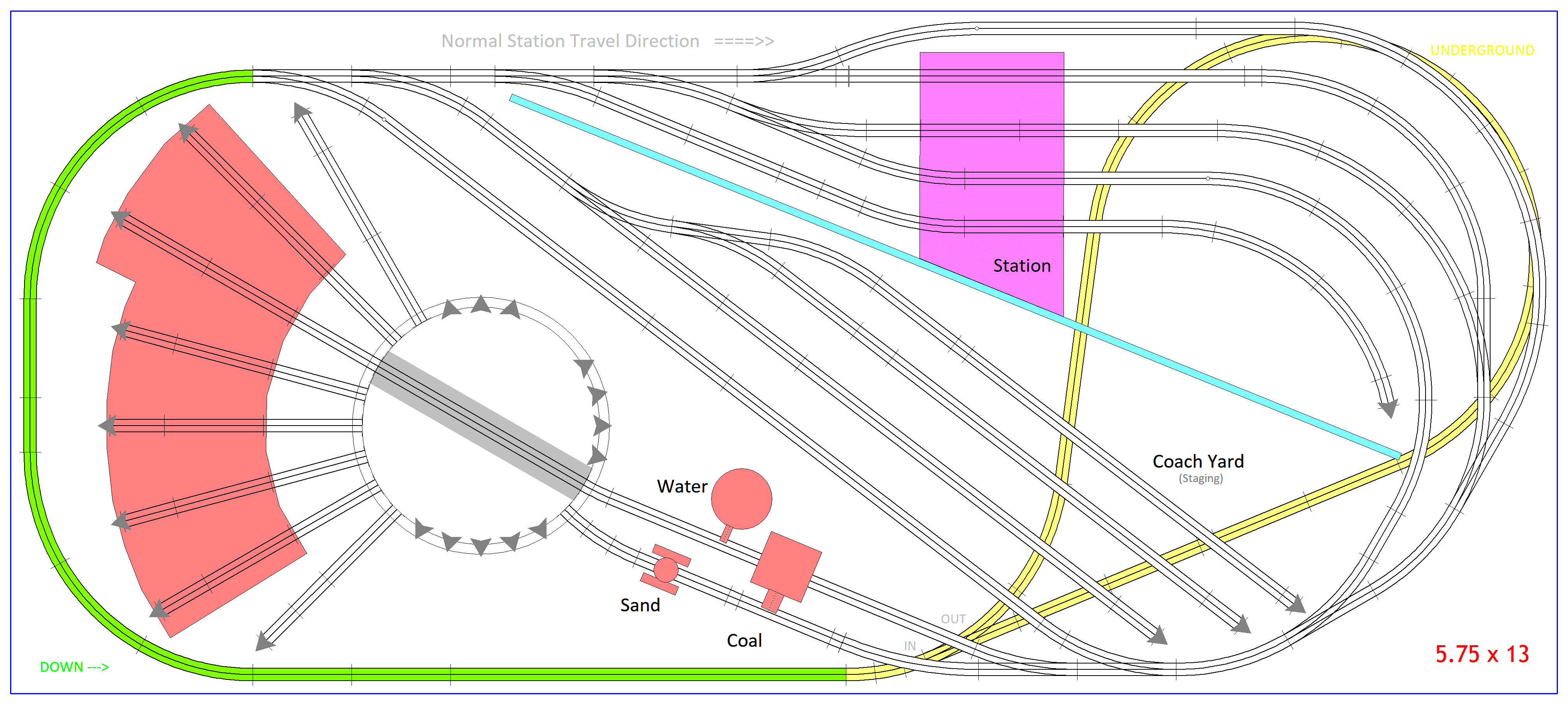 To achieve my goal I had to eliminate some features in the reference layout. The main line was reduce from double track to single track. The vestigial freight spurs (the team tracks and engine terminal supply tracks) all had to be eliminated, but this actually was a benefit as it concentrated the focus on this being a big-time passenger terminal. One coach yard track, One station spur track, One long, short, and outdoor turntable spur, and One turntable lead track had to be eliminated for space reasons, but the advantage is that their expensive turnouts would not have to be purchased. The reach problem was resolved by relocating the coach yard to the inside of the layout, rather than along the outside. As the original plan is a layout of its era, there were no scenic dividers or staging tracks (what they used to call "layover tracks") drawn, but the Coach Yard is very effective to use as pseudo staging tracks. The connection to the engine service area also had to be shifted from the return loop to the station loop, but as a side effect this improved operations.