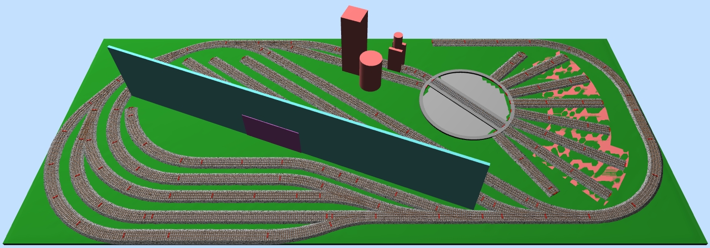 Note 1: For occasional railfanning, it is possible to make a continuous loop by connecting the end of the Staging tail track to end of the furthest Passenger Yard track. The curve passes through the tall Newspaper building [EXAMPLE].