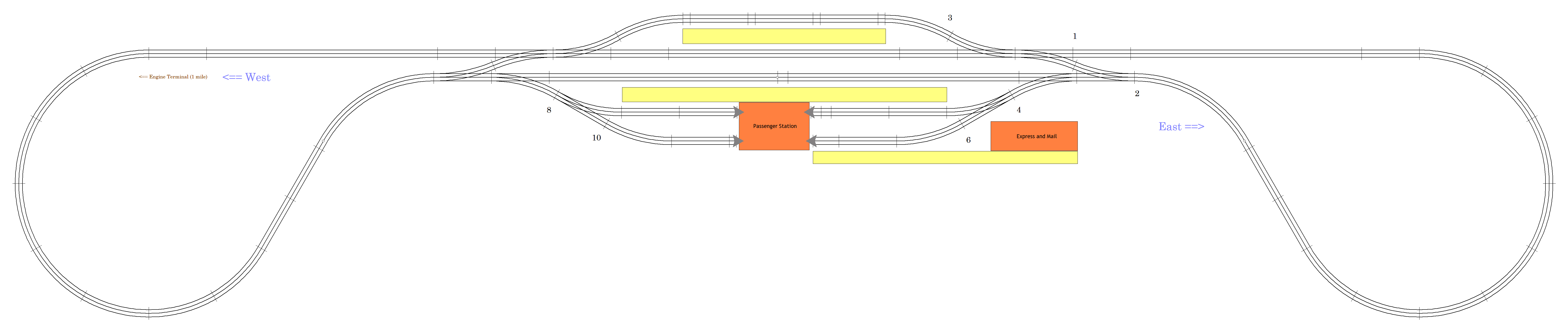 Note: Traffic was intended to move in a clockwise direction. Opposite direction running is possible though if you use the ovals as runarounds.